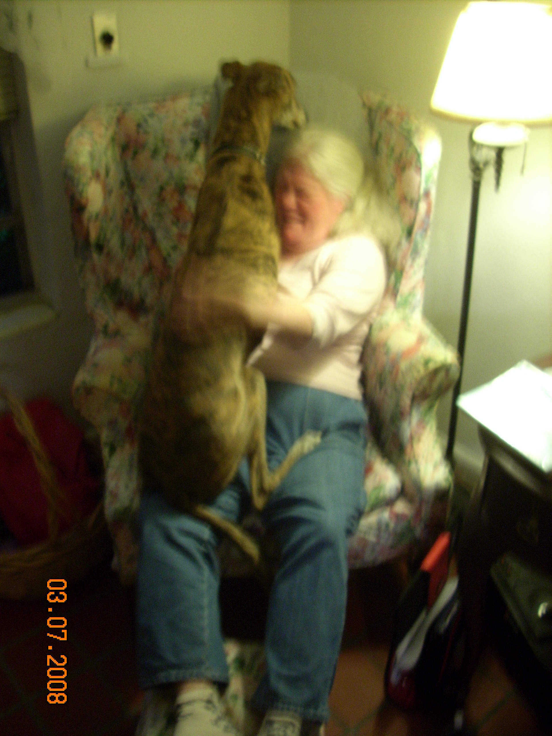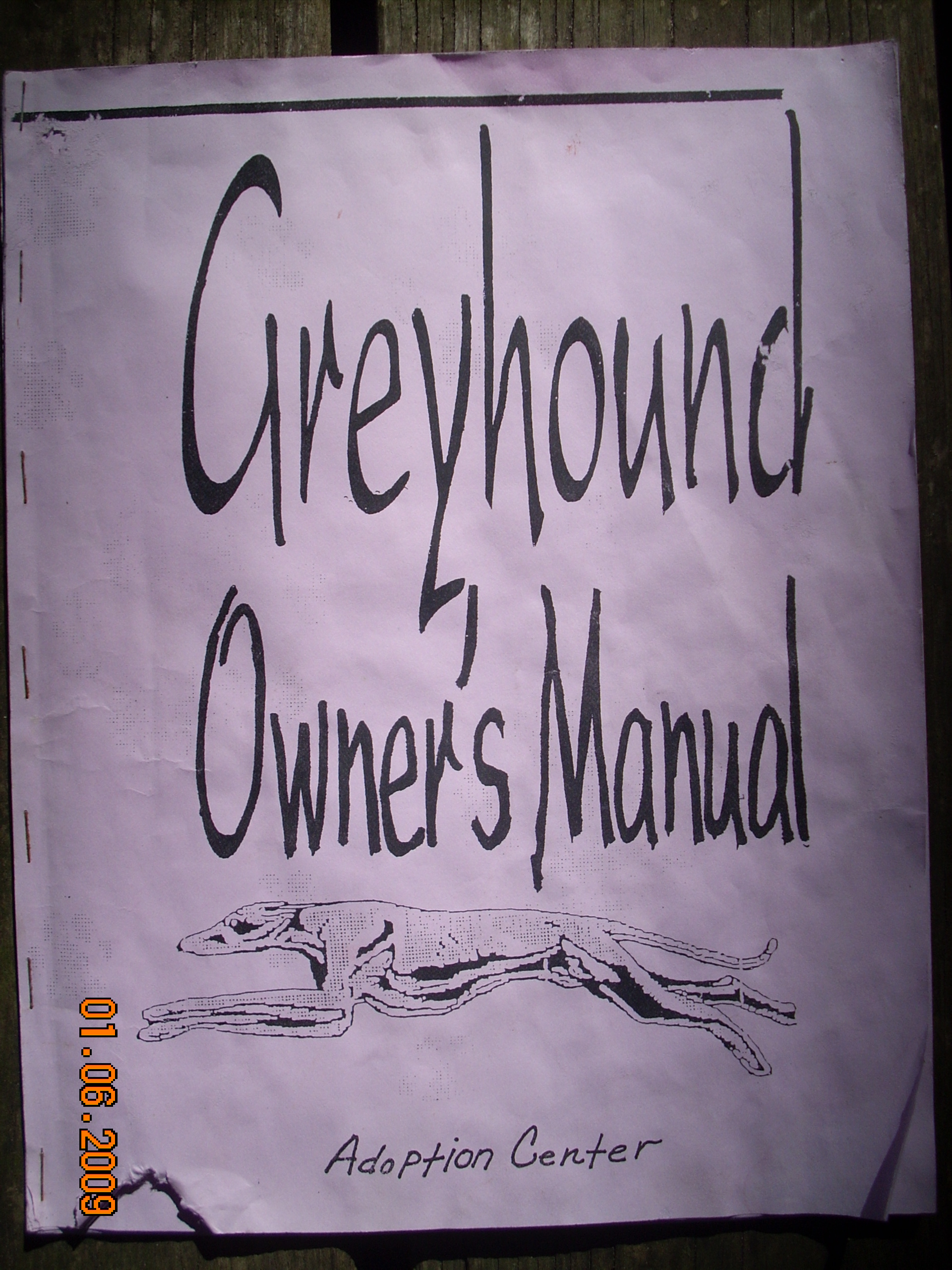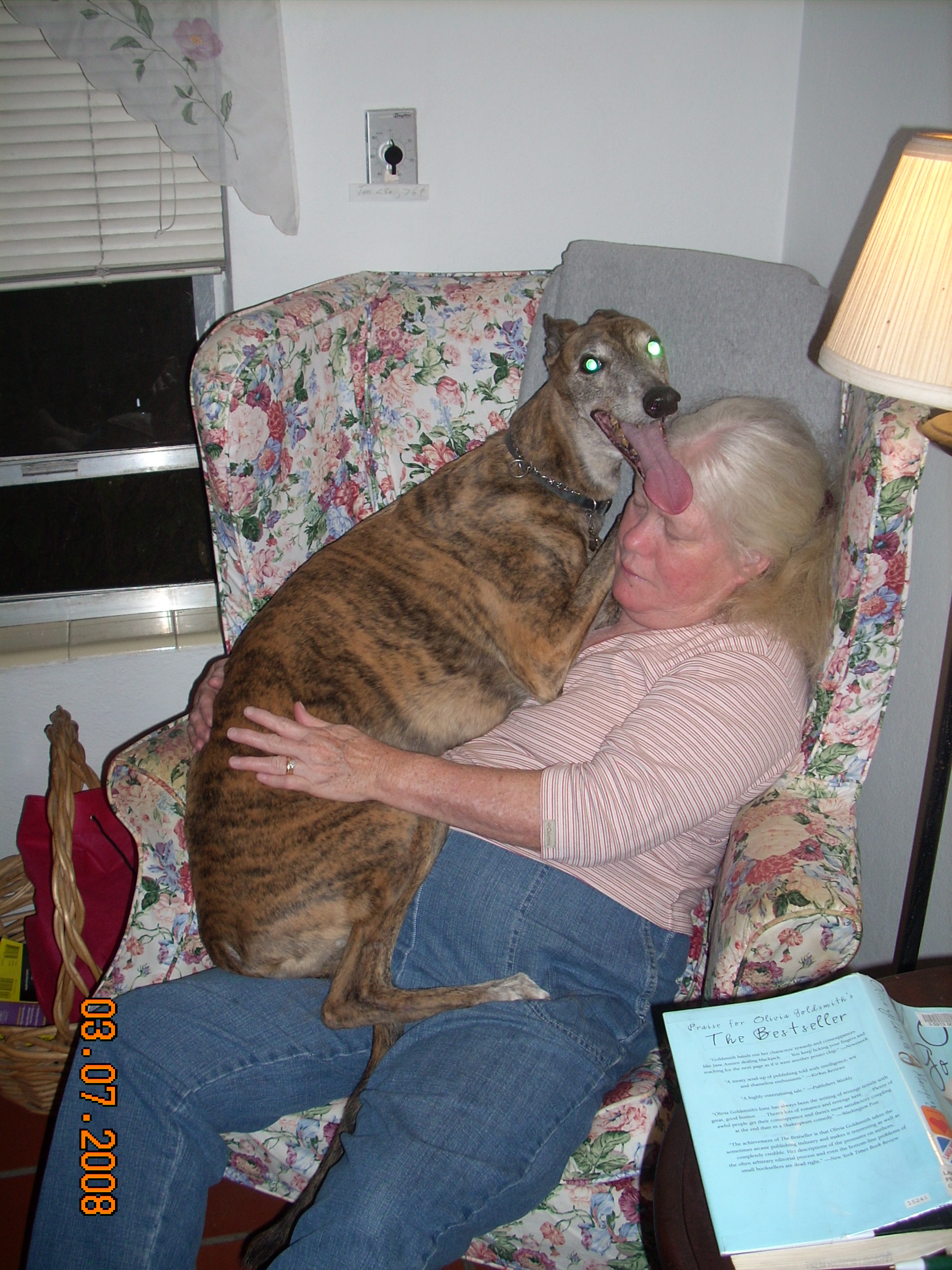 Sapphire, Weiner of the Racetracks! You made us rich too. You made us bettor. We got a large white crate And a large purple booklet: "Greyhound Owner's Manual", all for $67 You befriended Ginny and bit my backside. I tried to win you over but got my own pup. A circus is what that came to be. Antics and Laughter. Each morning and each evening a parade thru the house. Eventually you trusted me and also put out. That hot little tongue on my hand felt great. I'll see you in the clouds near heaven's gate.This "video" was a series of still pictures taken with a Logitech QuickCam Express. Flipping thru them at the right speed is hilarious.